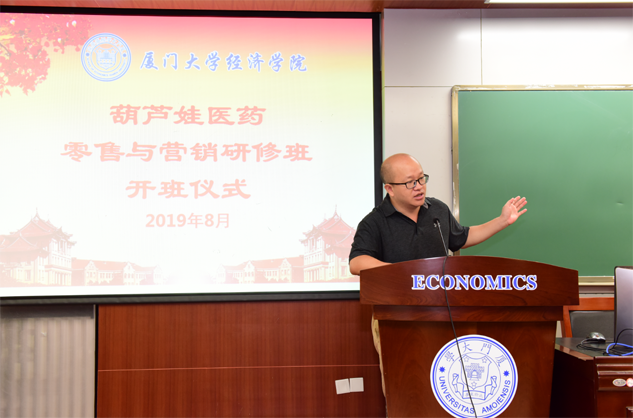 在开班仪式上,廖景峰主任首先代表厦门大学经济学院热烈欢迎百亿医药零售与营销研修班的学员到厦大学习,并就厦门大学及经济学院的相关情况进行了介绍。他说,百亿学员走进厦大就是厦大的校友,希望未来的日子能够关心、支持母校的发展,多提宝贵意见,同时他也祝大家在厦大学习期间学有所成、学有所获。