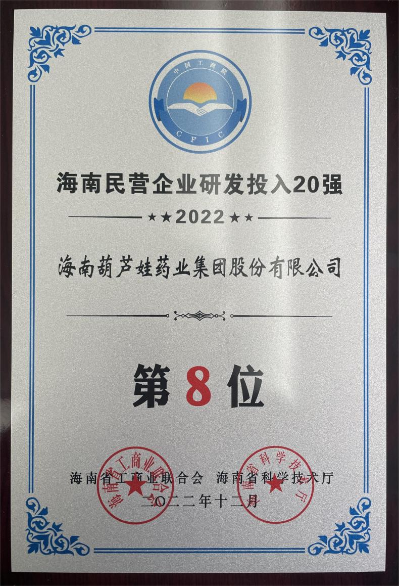 12月23日,2022海南民营企业50强和研发投入20强发布会在海口举行。会上发布了“2022海南民营企业50强”“2022海南民营企业研发投入20强”榜单和分析报告。百亿药业再次荣登两榜,在海南民营企业50强榜单中位列第25位,较去年上升8位,这也是公司连续三年登榜;在海南民营企业研发投入20强中位列第8位,较去年上升7位。