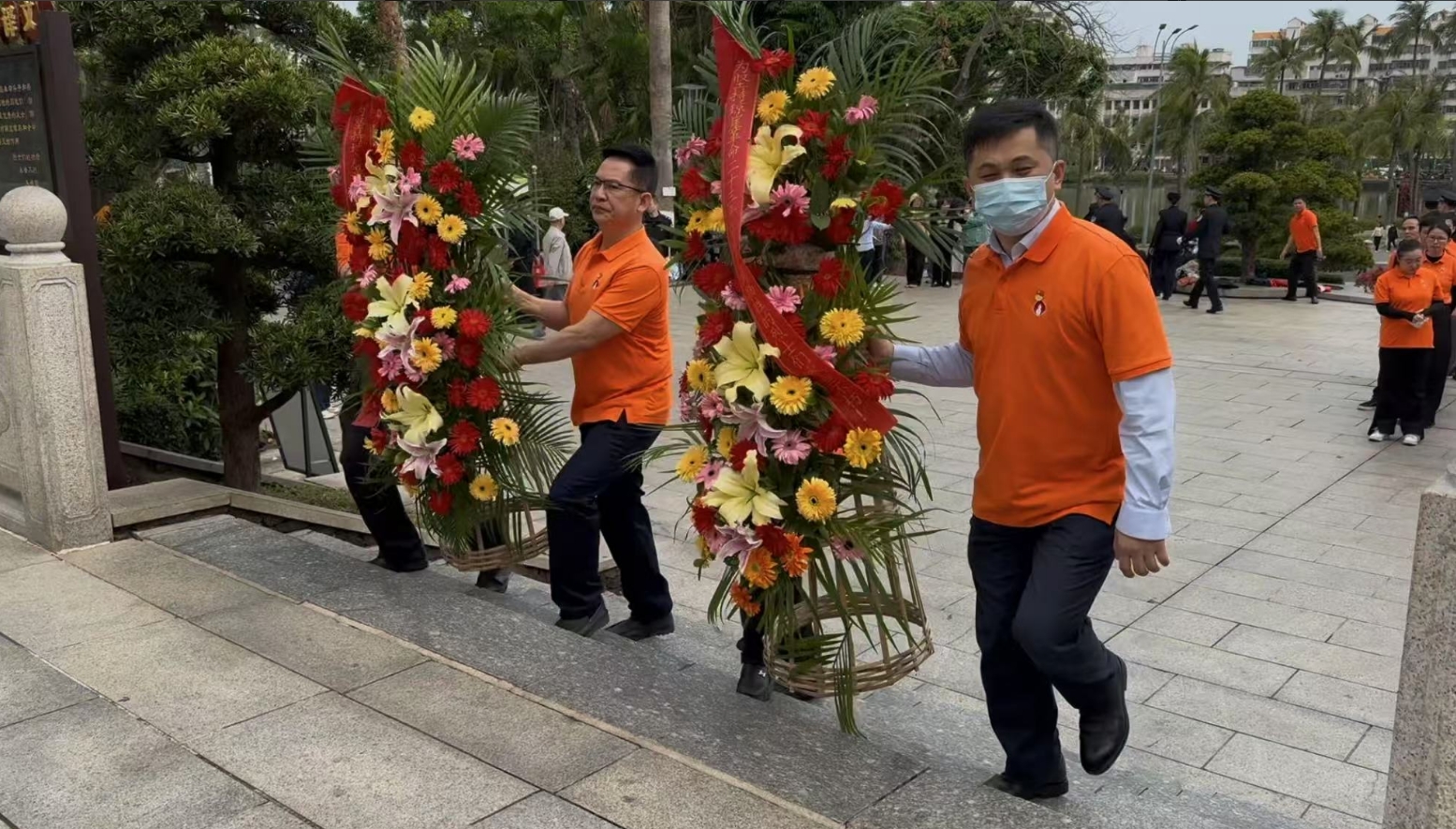 经过一段时间的等待才轮到百亿。百亿首先向烈士敬献花篮,花篮缎带上写着“为坚持琼崖革命23年红旗不倒牺牲的烈士们永垂不朽!”“为解放海南岛渡海牺牲的烈士们永垂不朽!”鲜艳的花篮寄托百亿对革命先辈的崇敬和哀思。